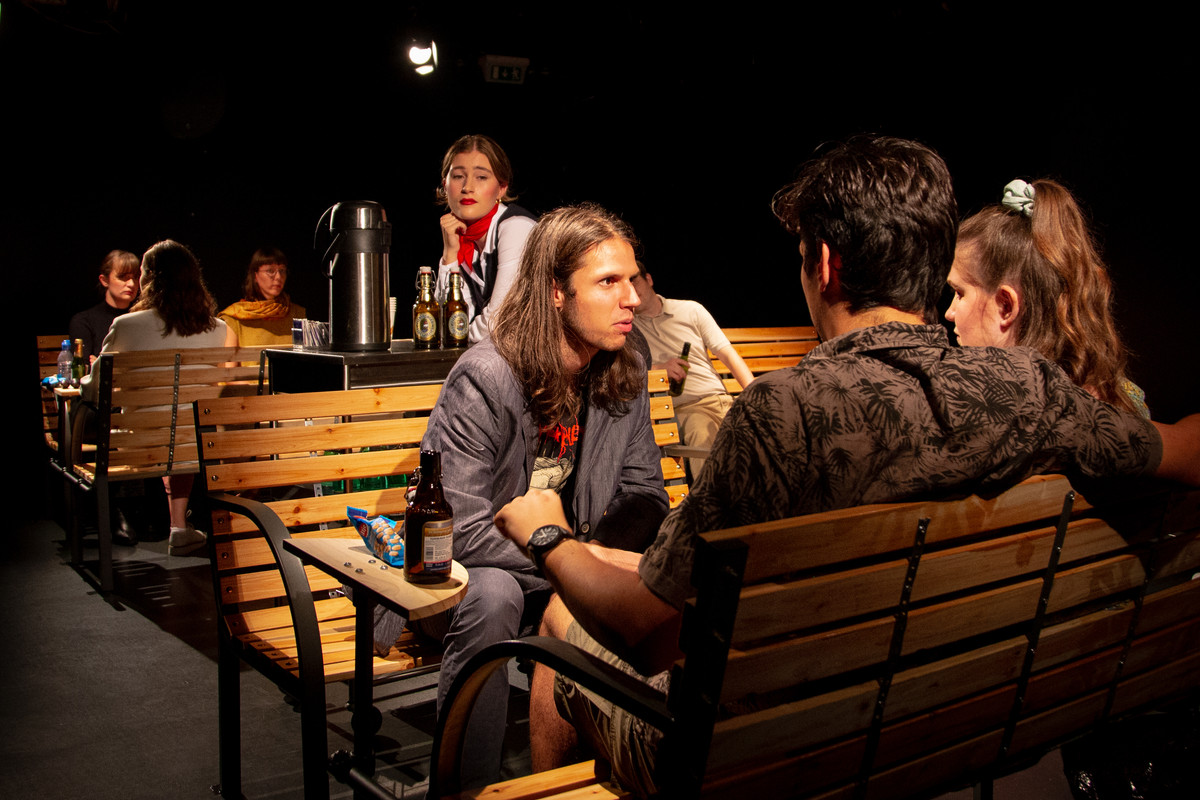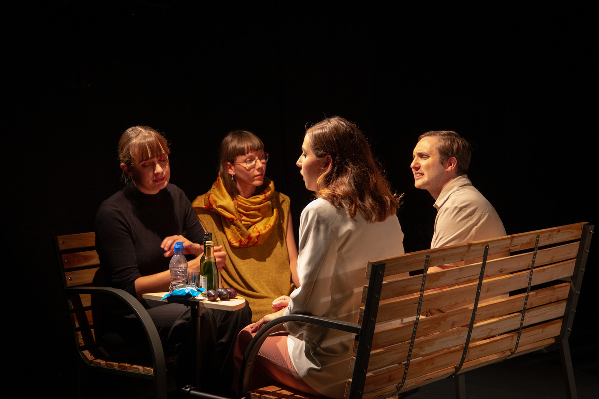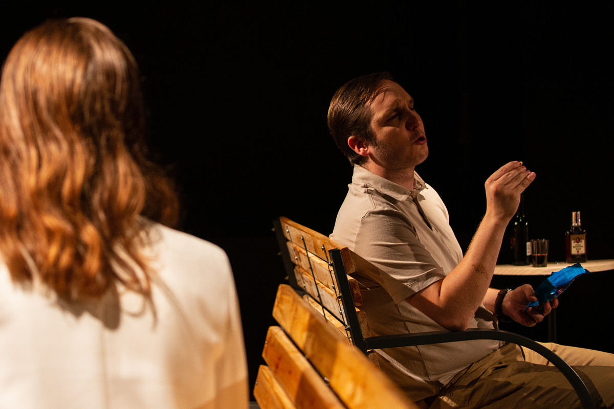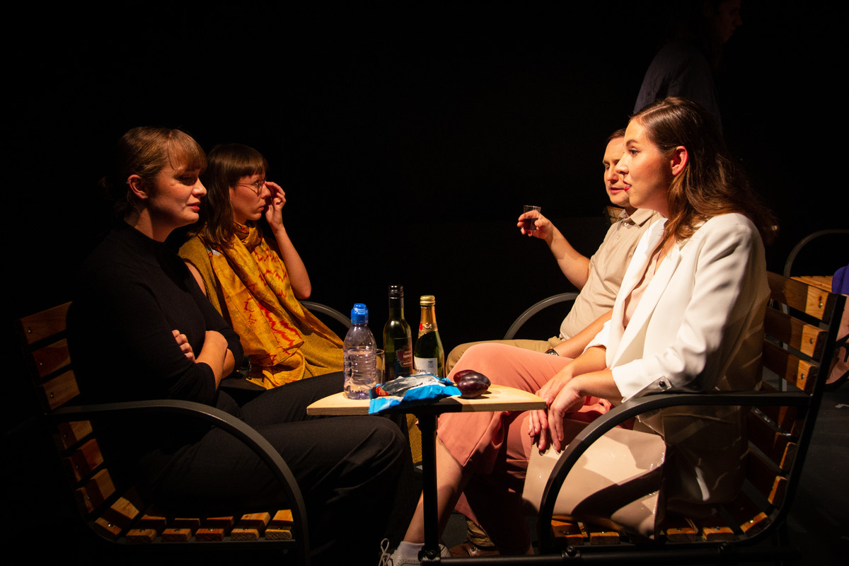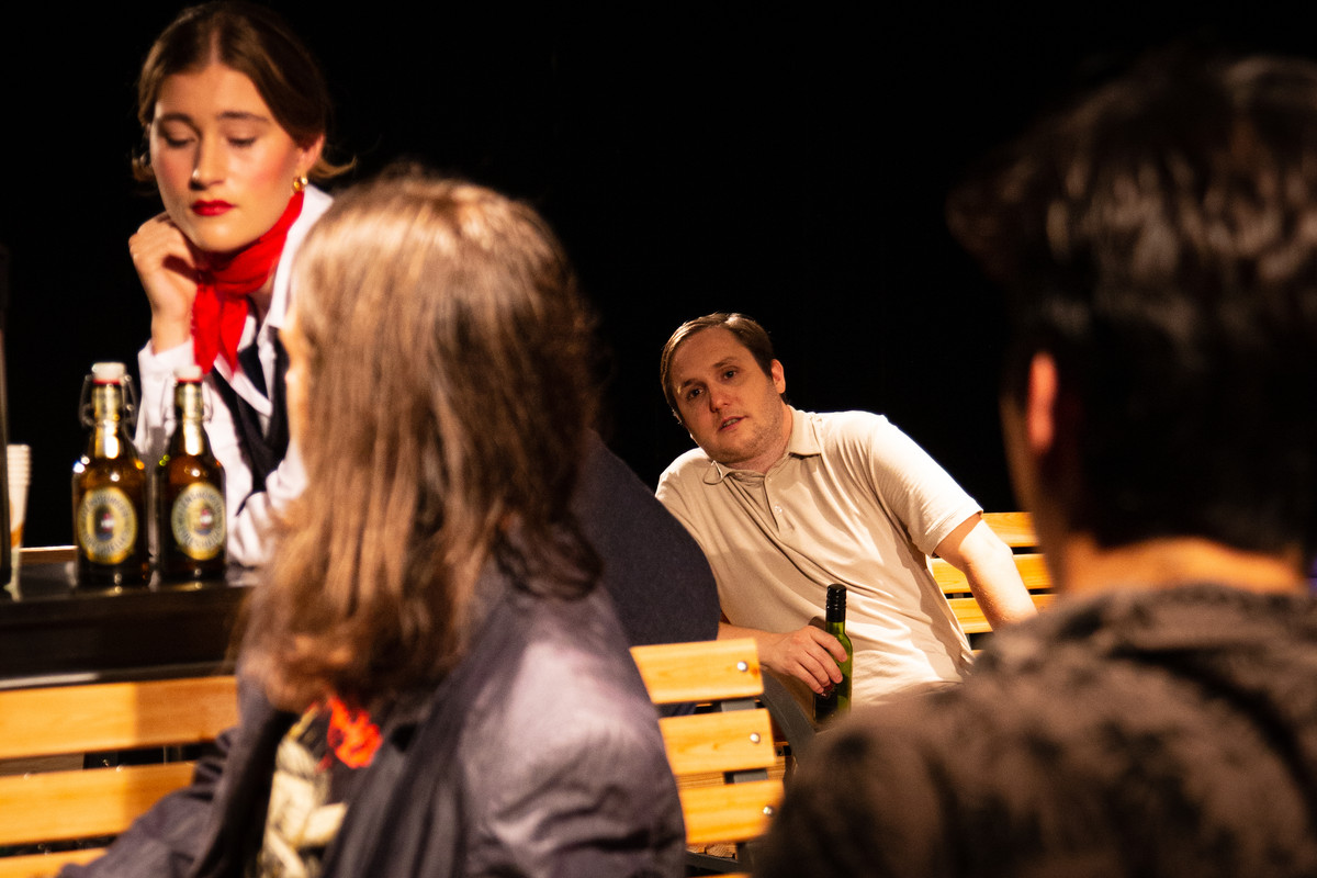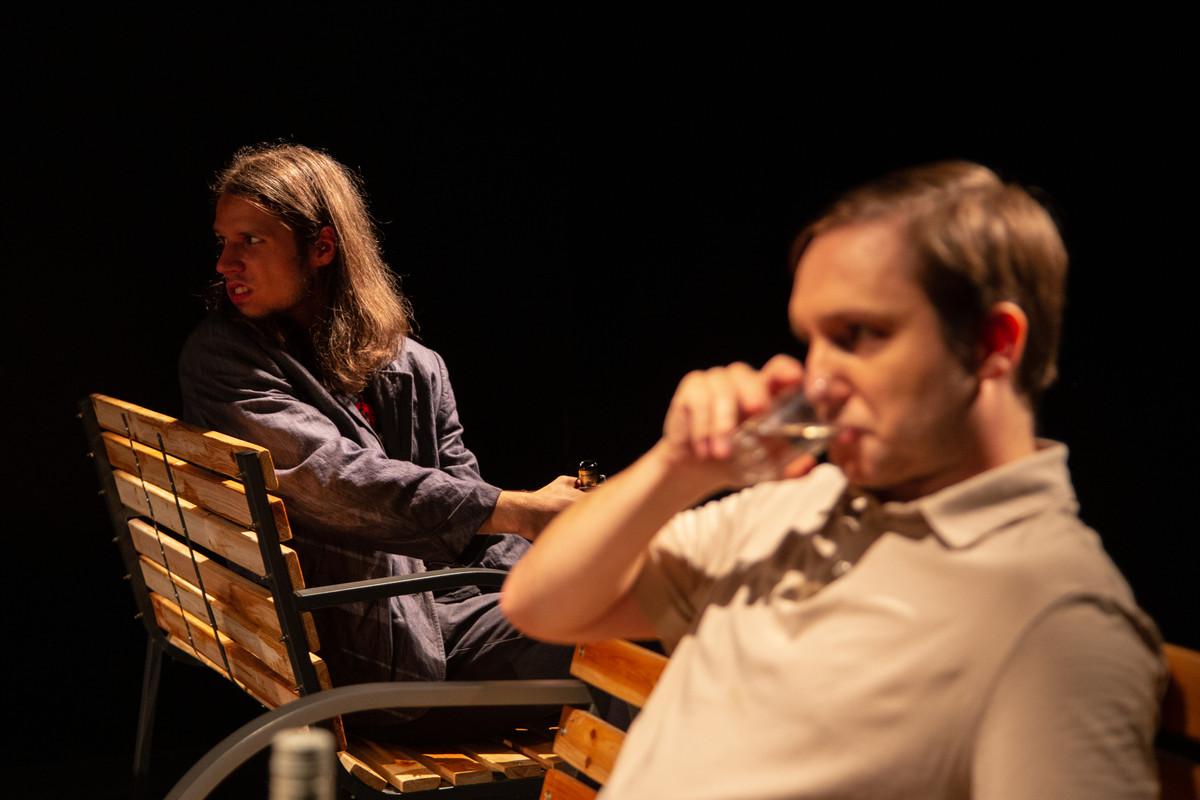 Plänen, Ängsten und Lebenstheorien zuzureden, während der Alkoholpegel laufend steigt. Das Ganze resultiert in einer absurden Gesprächsmelodie, die die Handlung des Stückes ausmacht.
