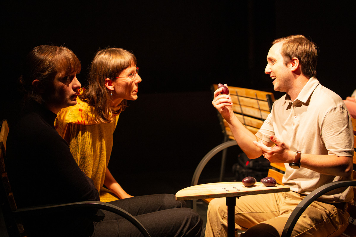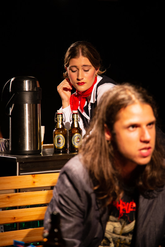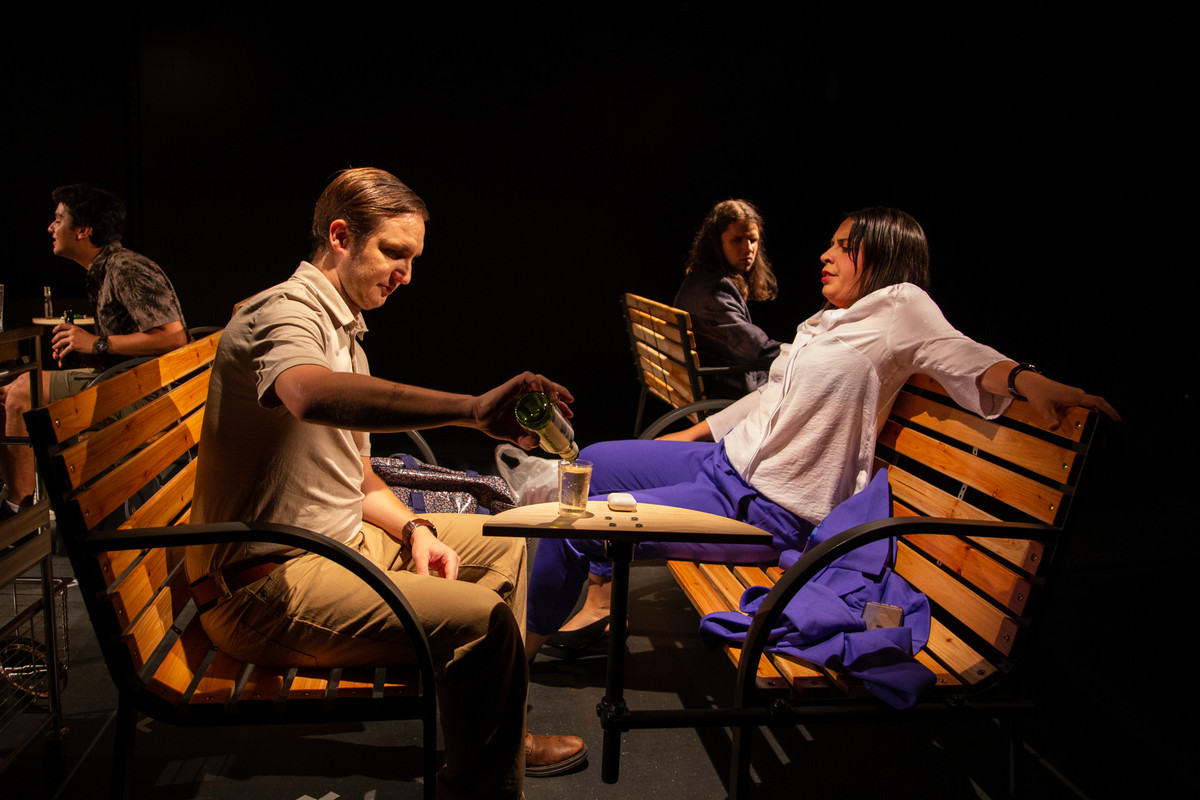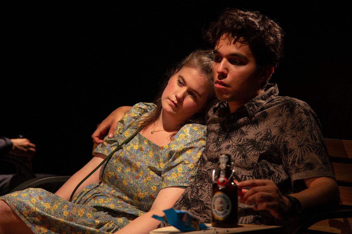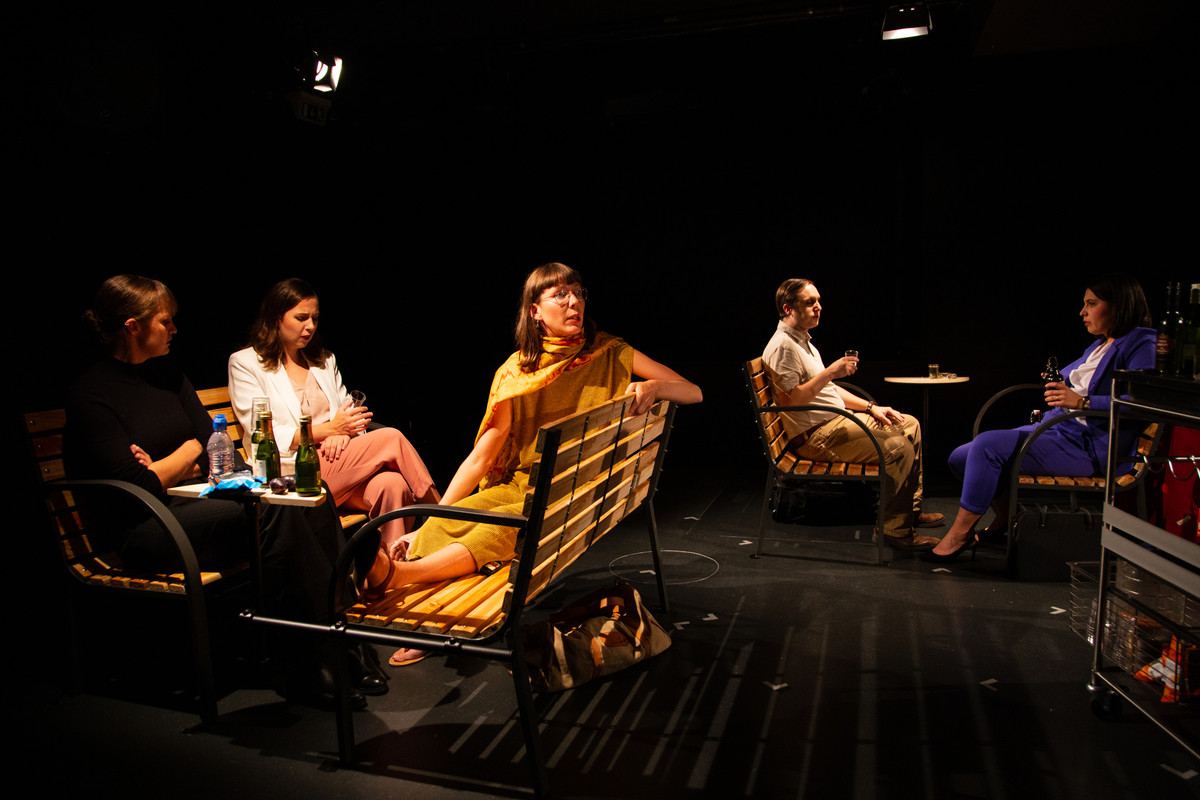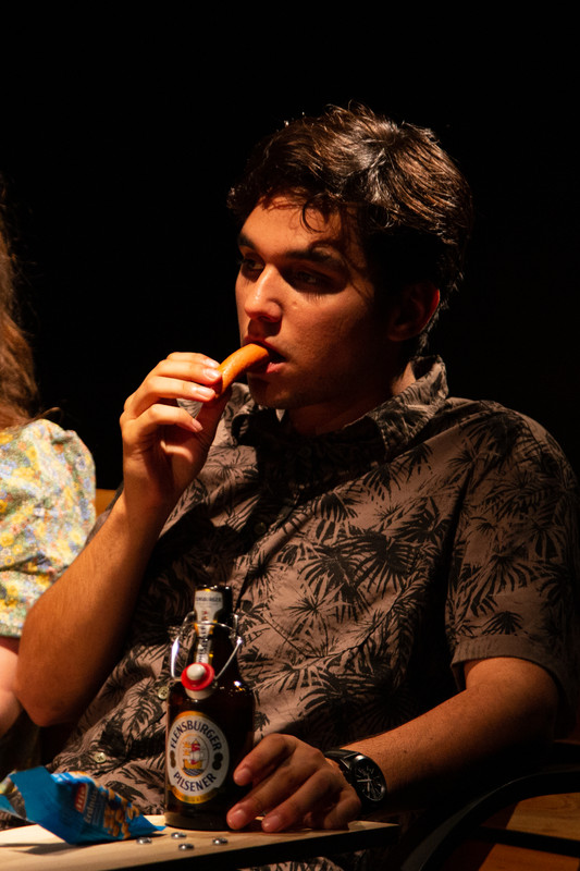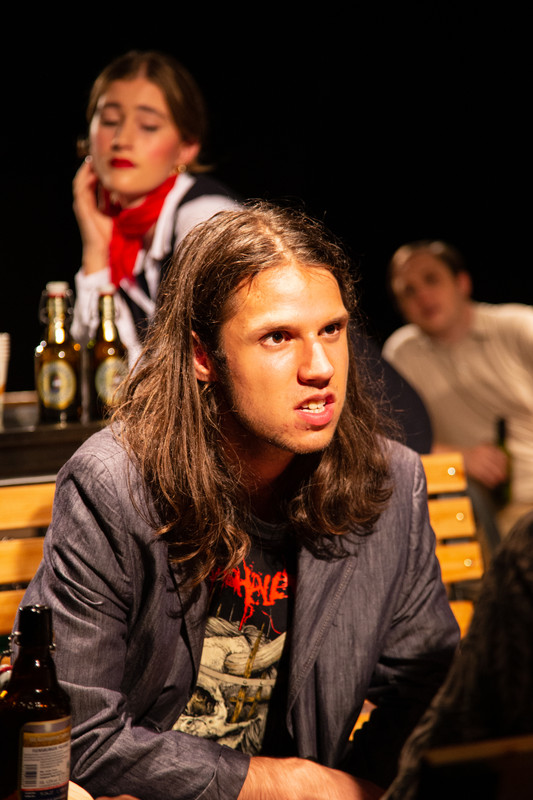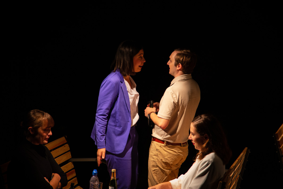 Plänen, Ängsten und Lebenstheorien zuzureden, während der Alkoholpegel laufend steigt. Das Ganze resultiert in einer absurden Gesprächsmelodie, die die Handlung des Stückes ausmacht.